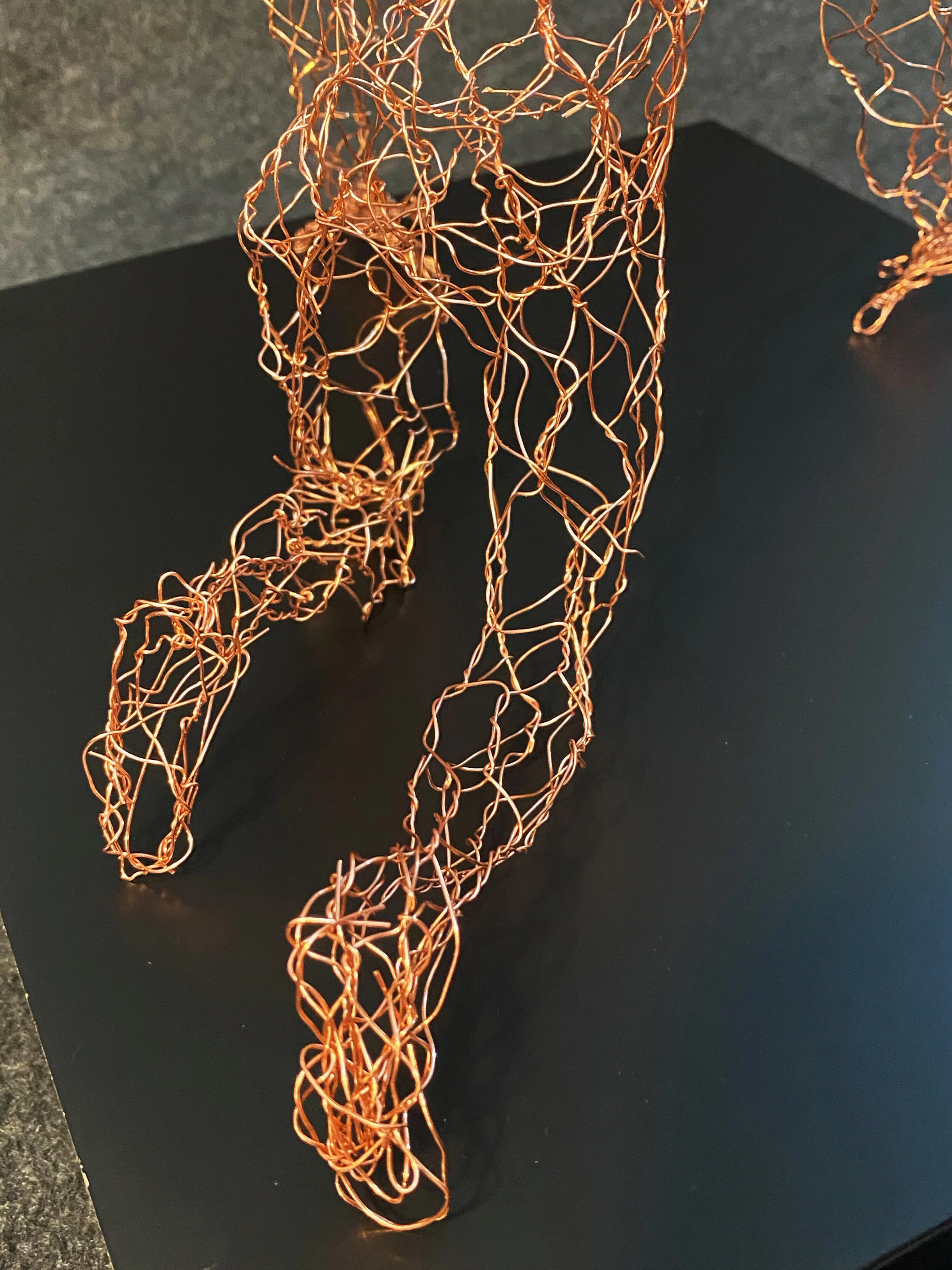 For a final project in a Textiles class, I decided to use copper wire in a braiding technique similar to chicken wire . I then used photo references to make a male figure in a crouched. This piece has great volume made by the negitive space the wire makes of the form.